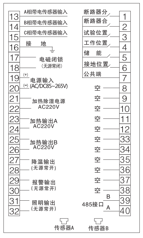 Dynamic indication of primary simulation diagram, trolley working position, test position, circuit breaker position, grounding switch position, spring energy storage status, two-way temperature and humidity control, live display, live locking output, sensor/load disconnection detection, intelligent false protection voice, lighting switch, energy storage switch, remote/local switch, opening and closing transfer switch, LCD display, adjustable upper and lower limits of temperature/humidity, cooling output, RS485 communication, electrical phase test hole, and human body induction.